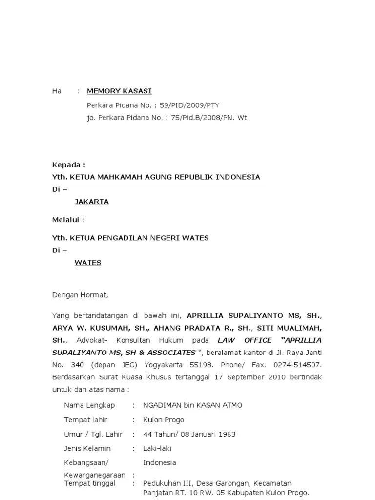 Kasasi Pengertian Tujuan Fungsi Alasan Tata Caranya from seputarilmu.com Membuat sktm dari desa atau kelurahan dengan pengantar dari rt/rw. Pemeriksaan yang dilakukan adalah apakah ada pelanggaran hukum, apakah hukum tidak diterapkan, atau apakah pengadilan melampaui kewenangan dalam memeriksa dan memutus perkara. Dengan ini mohon mengajukan permohonan pemeriksaan kasasi terhadap isi putusan pengadilan tinggi bandung tanggal 20 desember 2012 dalam perkara. Tenang geng, jaka kasih cara mengatasi memori hp penuh padahal aplikasi sedikit, cekidot! Contoh surat kuasa kontra perdata bisa atau tidaknya aplikasi. Jerinx menyerahkan memori kasasi atas vonis 10 bulan penjara terkait kasus idi kacung who. Dan selanjutnya untuk memudahkan pembuatan memori kasasi, pemohon kasasi i dan pemohon kassi ii mohon disebut sebagai para pemohon kasasi. Wani lilianti, perempuan, umur 33 tahun, lahir di jakarta, pada tanggal 23 agustus 1980.